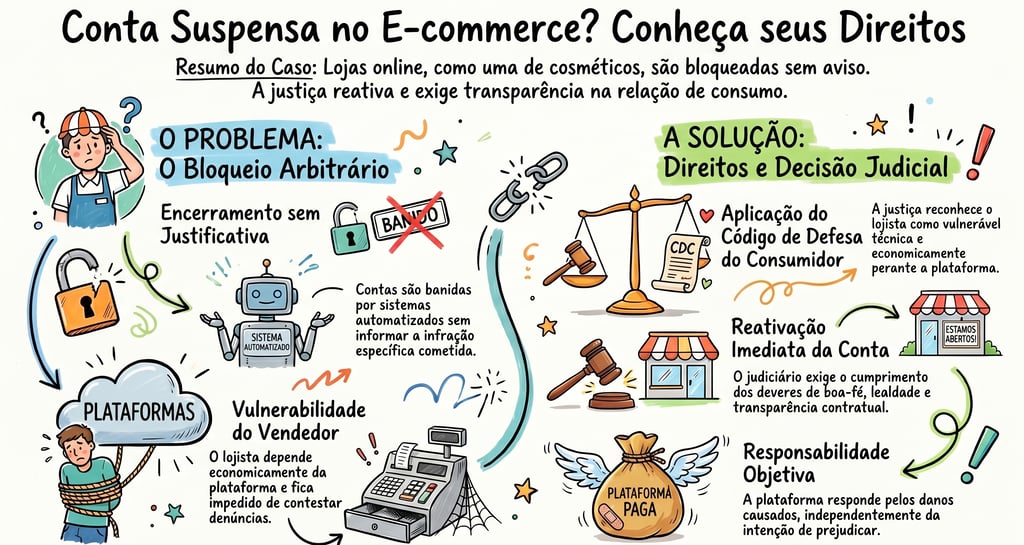 No caso analisado, uma loja virtual de cosméticos teve sua conta encerrada por uma grande plataforma de e-commerce. O encerramento foi motivado por denúncias recebidas por um sistema automatizado, mas a plataforma nunca informou com precisão qual teria sido a infração cometida. A lojista ficou sem acesso à conta, sem conseguir contestar as denúncias e sem qualquer alternativa oferecida pela plataforma.